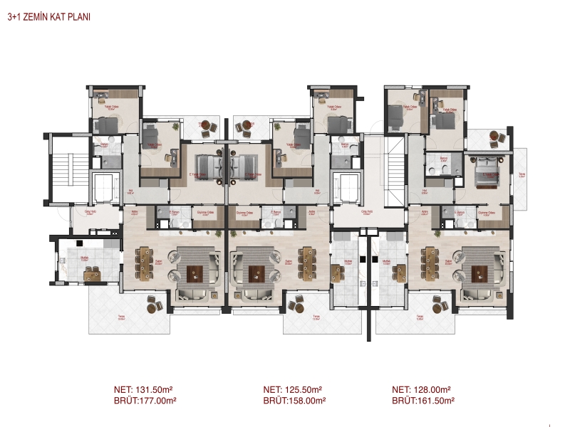 3+1 Zemin Katlar: 177 m² brüt, 131.50 m² net kullanım alanı