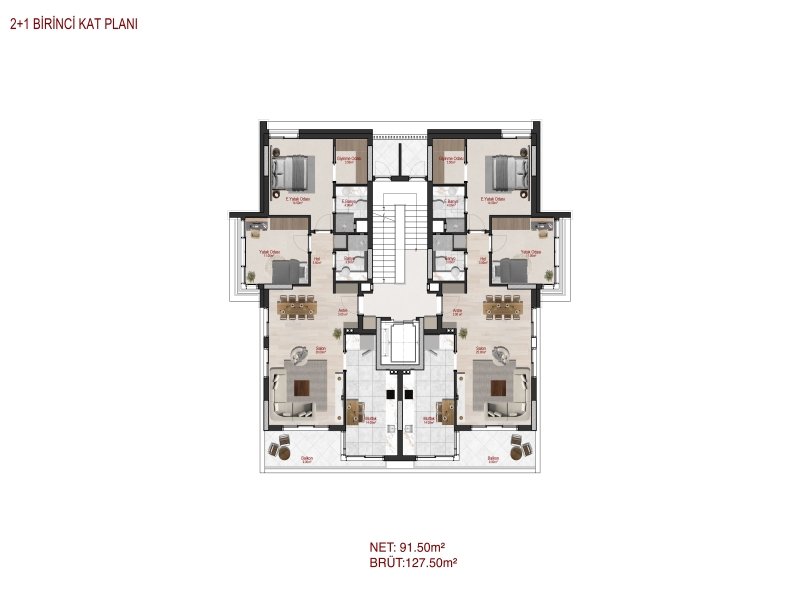 2+1 Normal Katlar: 127.50 m² brüt, 91.50 m² net kullanım alanı