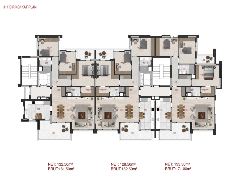 3+1 Normal Katlar: 181.50 m² brüt, 132.50 m² net kullanım alanı