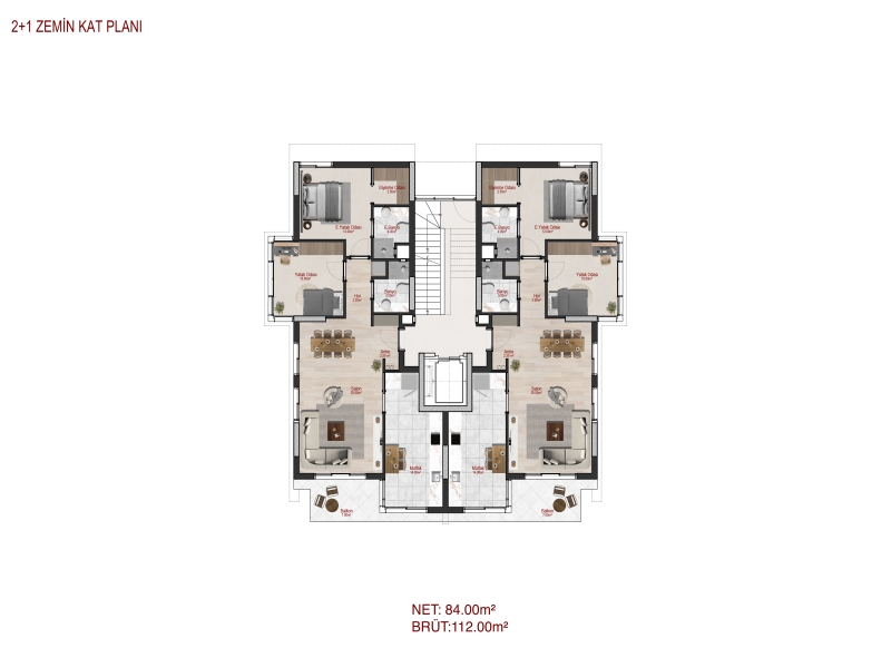 2+1 Zemin Katlar: 112 m² brüt, 84 m² net kullanım alanı